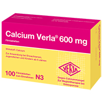 Calcium Verla 600 mg Filmtabletten. Wirkstoff: Calciumcarbonat. Anwendungsgebiete: zur Vorbeugung eines Calciummangels bei erhöhtem Bedarf (z.B. Wachstumsalter, Schwangerschaft, Stillzeit)und zur unterstützenden Behandlung der Osteoporose.