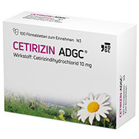 Cetirizin-ADGC Filmtabletten. Wirkstoff: Cetirizindihydrochlorid. Anwendungsgebiete: zur Linderung von Nasen- und Augensymptomen bei saisonaler und ganzjähriger allergischer Rhinitis (Heuschnupfen) und zur Linderung von chronischer Nesselsucht (chronischer idiopathischer Urtikaria).