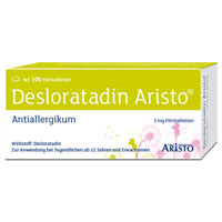Desloratadin Aristo 5 mg Filmtabletten. Wirkstoff: Desloratadin. Anwendungsgebiete: bessert die Symptome bei allergischer Rhinitis (durch eine Allergie hervorgerufene Entzündung der Nasengänge, beispielsweise Heuschnupfen oder Hausstaubmilben-Allergie) bei Erwachsenen und Jugendlichen ab 12 Jahren. Diese Symptome beinhalten Niesen, laufende oder juckende Nase, Juckreiz am Gaumen und juckende, gerötete oder tränende Augen. Desloratadin Aristo wird ebenfalls angewendet zur Besserung der Symptome bei Urtikaria (ein durch eine Allergie hervorgerufener Hautzustand). Diese Symptome beinhalten Juckreiz und Quaddeln.