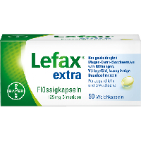 Lefax extra Flüssigkapseln, Weichkapseln. Wirkstoff: Simeticon. Anwendungsgebiete: zur Linderung und symptomatischen Behandlung gasbedingter Magen-Darm-Beschwerden wie Blähungen (Meteorismus), Völlegefühl, Aufstoßen, krampfartige Bauchschmerzen, postoperative gasbedingte Schmerzen und funktionelle Dyspepsie und zur Vorbereitung der Diagnostik im Bauchbereich, wie z.B. Endoskopie, Röntgen und Sonographie.