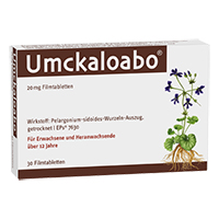 Umckaloabo 20 mg Filmtabletten. Wirkstoff: Pelargonium-sidoides-Wurzeln-Auszug, getrocknet. Anwendungsgebiete: zur symptomatischen Behandlung der akuten Bronchitis (Entzündung der Bronchien).